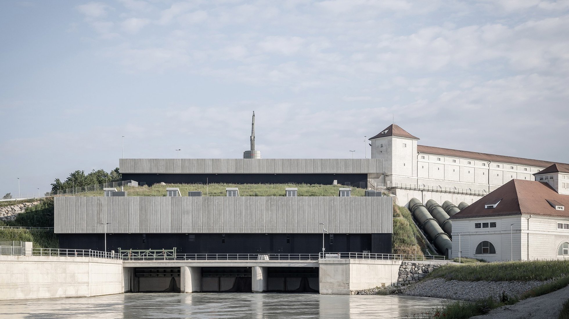 Die denkmalgeschützte Turbinenhalle aus dem Jahr 1924 macht es vor: Auch Industriegebäude können einen architektonischen Ausdruck besitzen, der Staunen lässt. Was auf der ehemals größten Baustelle Europas vor knapp 100 Jahren entstand, erfüllte deswegen nicht nur über Jahrzehnte hervorragend seinen Zweck, sondern feierte seine Funktionalität auch mit einer Architektur, die mehr sein wollte als bloße Hülle. Der Stolz über das technische Können wurde hier in Form übersetzt. Das erinnert an die AEG-Turbinenfabrik von Peter Behrens – und legt die Latte hoch. Wie gut, dass der Bauherr VERBUND Innkraftwerk GmbH die Aufforderung annahm und für den Neubau einen Architekturwettbewerb durchgeführt hat. Die Sieger, Robert Maier Architekten, sind sich bei ihrem Entwurf des größten deutschen Wasserkraftwerksprojekts sichtbar ihrer Verantwortung bewusst und haben das Ingenieurgebäude ästhetisch durchdekliniert. So ist ein Gebäude entstanden, das sich dezent und trotzdem kraftvoll in seine Umgebung einfügt.